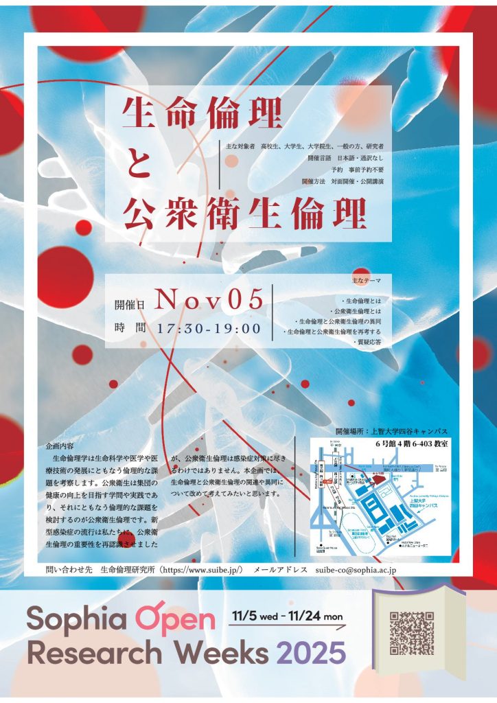 上智大学生命倫理研究所は、上智大学研究機構主催の Sophia Open Research Weeks(SORW)に今年も参加しますので、ご案内申し上げます。どなたでも参加は自由(無料)です。